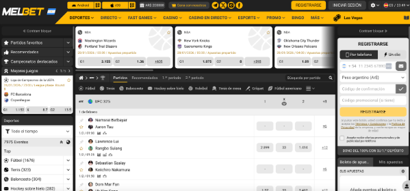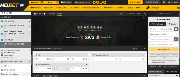 En Melbet Argentina, los principiantes en apuestas UFC pueden aprovechar nuestro bono de bienvenida al registrarse y depositar un mínimo de 56 ARS. Tras verificar su número de teléfono, recibirán automáticamente el bono, que debe invertirse 5 veces en apuestas combinadas con cuotas de 1.40 o más. Este bono es una excelente oportunidad para empezar en el emocionante mundo de las apuestas UFC.